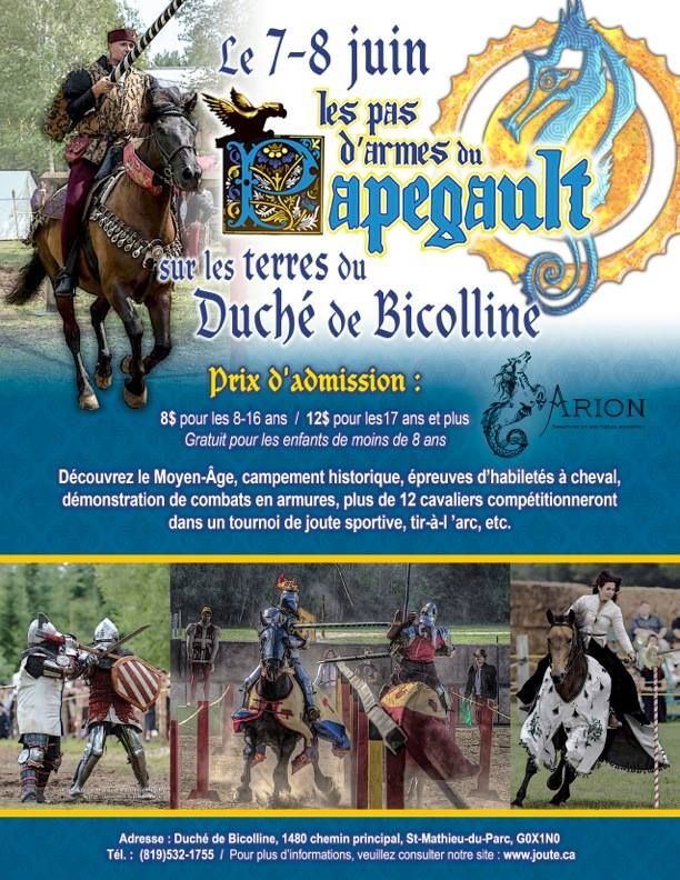 Les pas d'armes du Papegault is a new jousting event which will be welcoming 13 competitors from all over Quebec on the wonderful site of "Le Duché de Bicolline" in St-Mathieu-du-Parc Quebec, Canada. There will be over 130 re-enactors on the site with all kind of demonstration: foot combat, live steel, camp life... etc. This event will be held on June 7th and 8th, 2014.