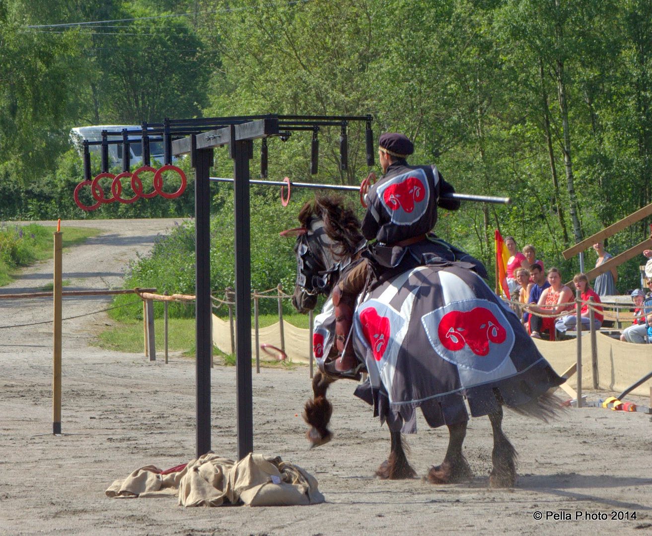 The Swedish Championship Jousting Tournament focuses more on riding skills than on traditional tilting, and since we started to do competitions in Mounted Skills at Arms, a couple of years ago, it has been a great success. The Swedish version of Mounted Skills at Arms is riding a course as fast as possible while hitting all the targets with different weapons (lance, spear and sword). It is maximum speed and gallop all the way. If you miss a target you receive a penalty of 10 seconds.